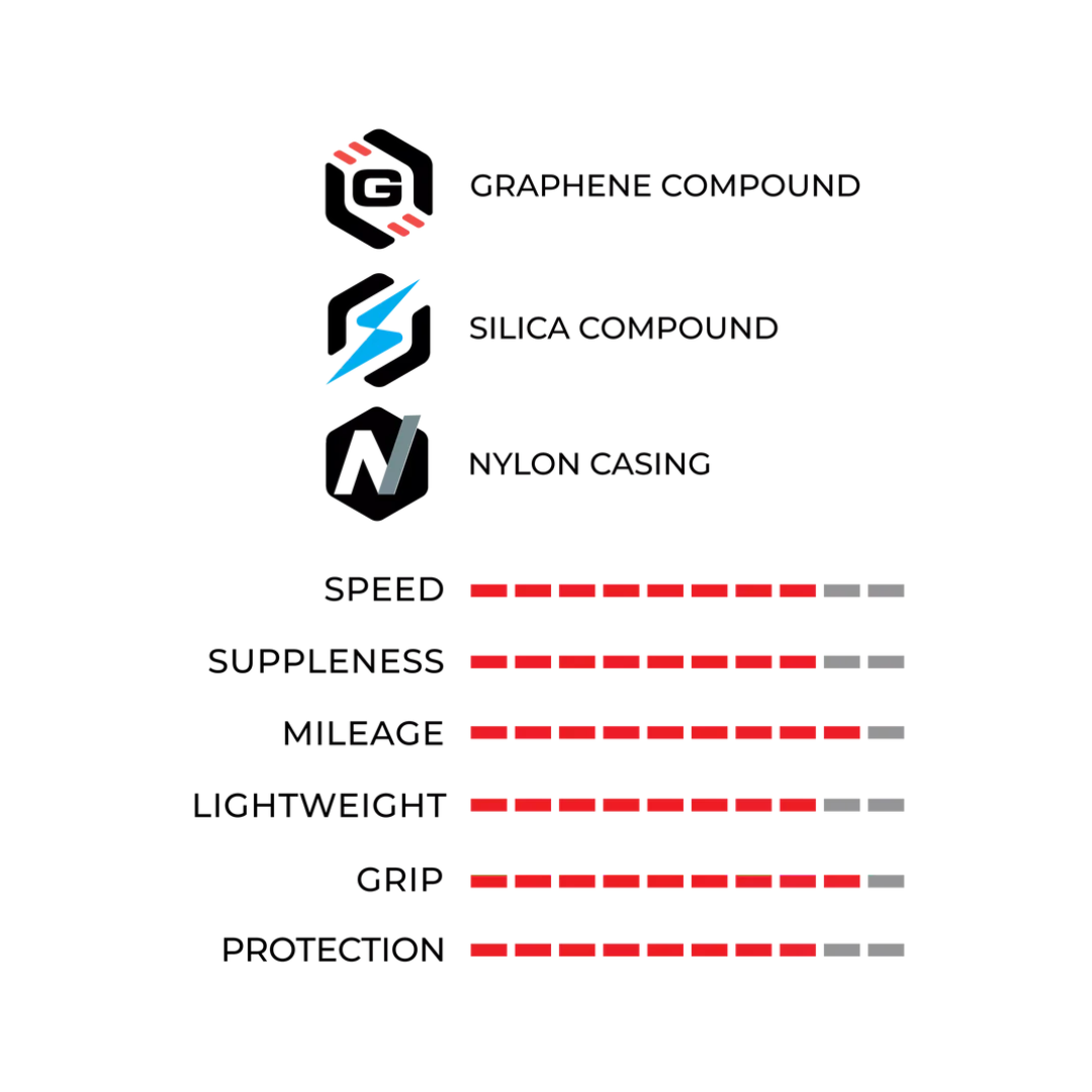 The Race Formulation powered by Graphene + Silica is a durable compound mix optimized for long-lasting grip and low rolling resistance with extended durability.