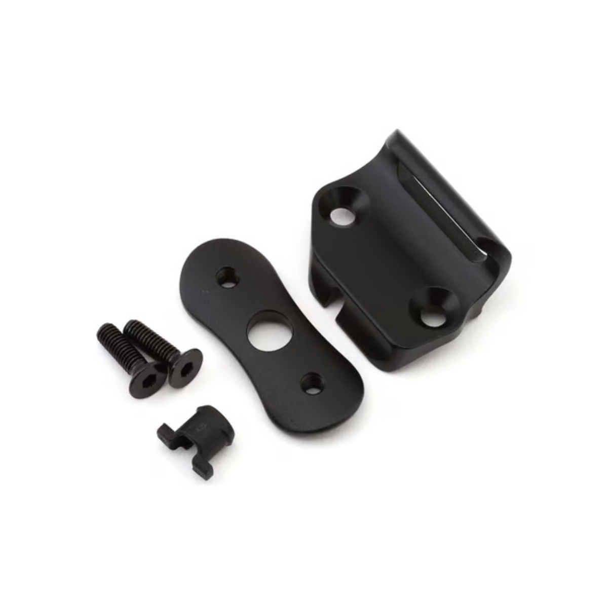 Front derailleur mount kit with mounting hardware designed for use with the Specialized Aethos and Tarmac SL8. The small notch on the side of the mount allows a Shimano Di2 wire to pass through for a clean look.