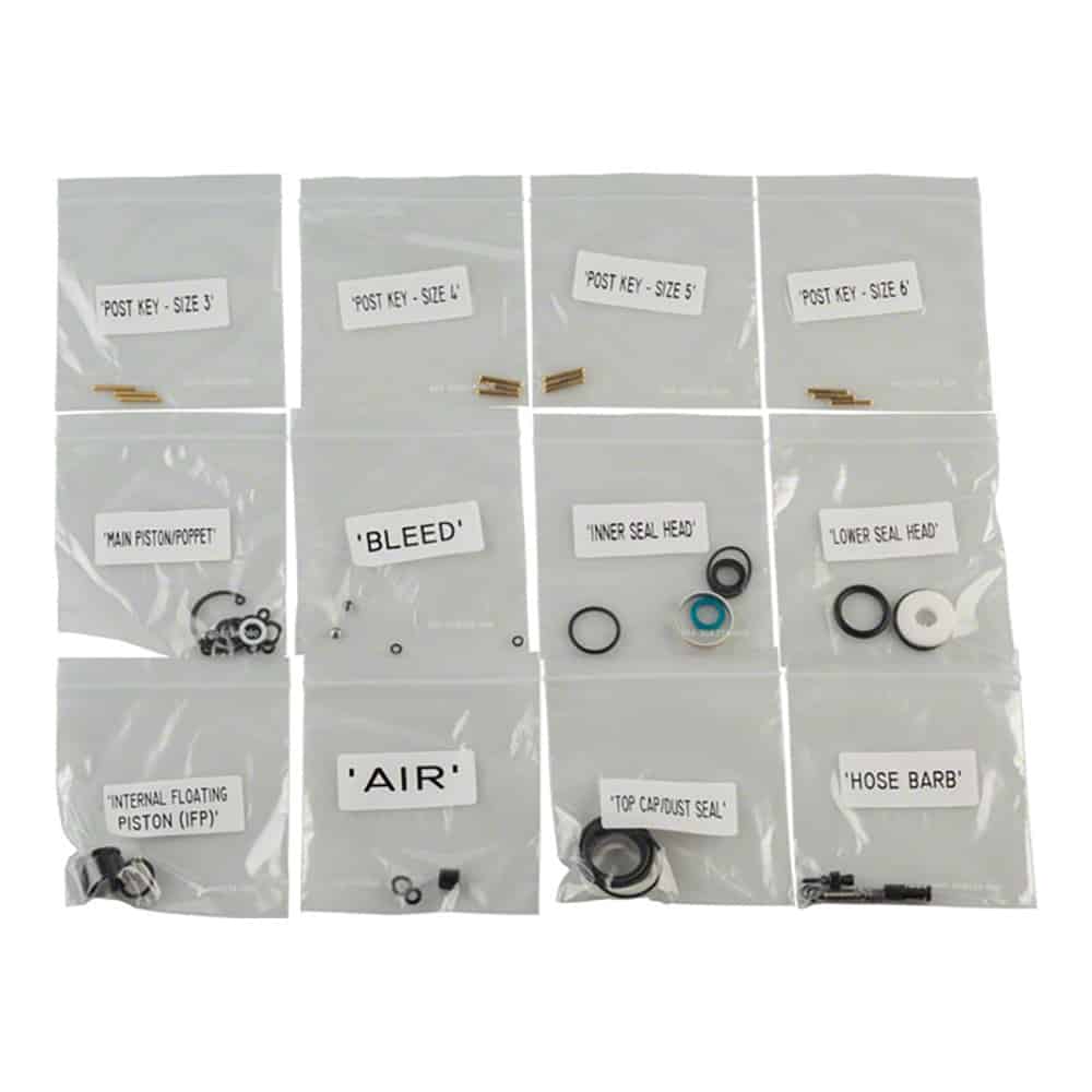 - Full service kit includes basic service kit plus bushing-collar dust wiper, bleed screw and threaded barb (post) attachment with o-rings, tubing strain relief collar, keyway bushings, and complete lower air valve assembly