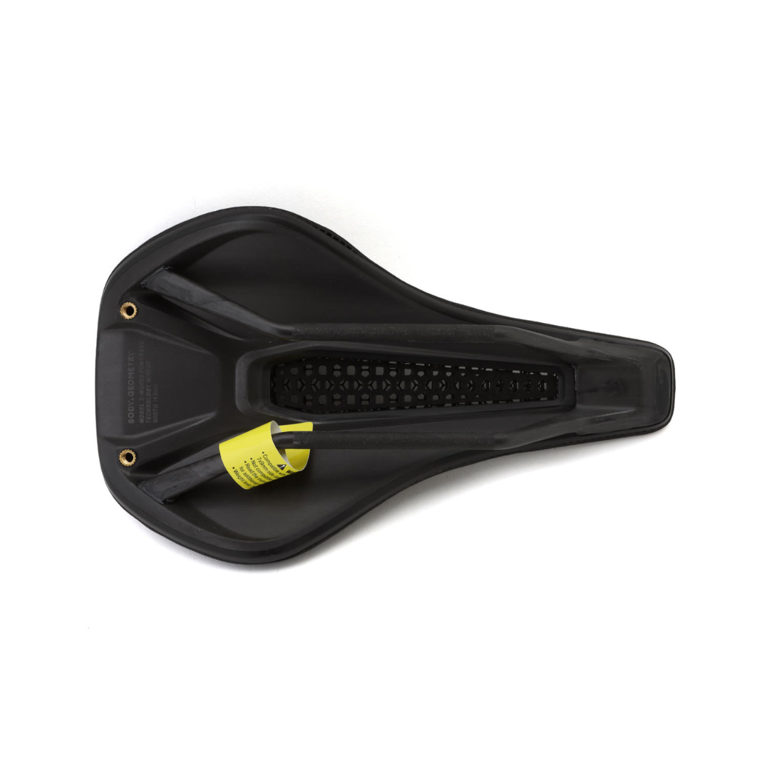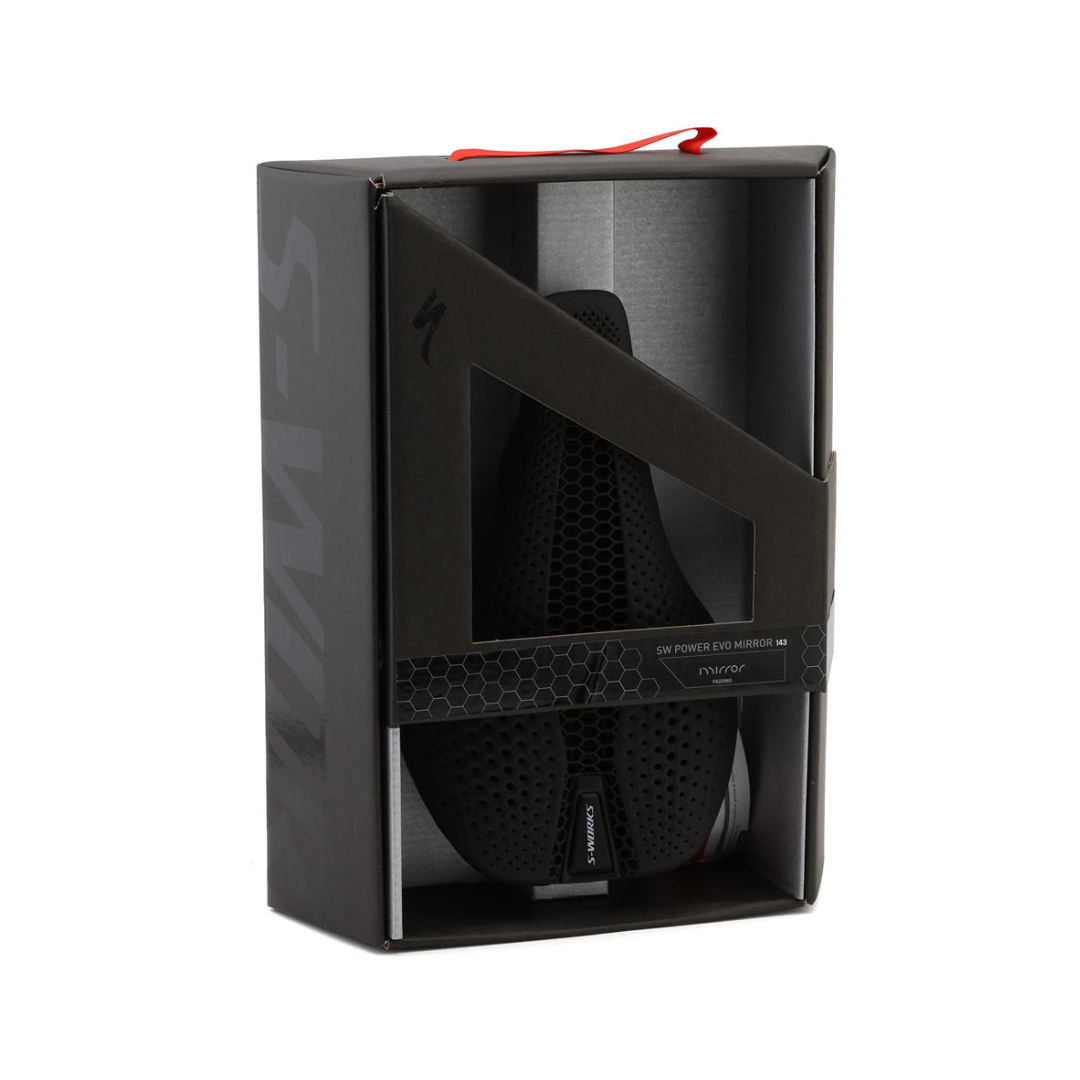 The S-Works Power EVO with Mirror Saddle combines lessons learned in the Body Geometry lab and through input from elite riders to create a feather-light saddle with incredible comfort and performance. Engineered for dynamic riders who move front to back, the advanced 3D printed Mirror construction has been tweaked to offer significantly less nose and sit bone pressures vs. foam saddles, plus 18% less midline pressure vs. the original S-Works Power Mirror saddle, all while providing the support needed to power through the longest, toughest days in the saddle. Underneath, a full carbon base and integrated ovalized carbon fiber rails quell minute road vibrations and improve ride compliance over rougher surfaces. Combine everything together with the popular Power saddle profile, and the result is a comfortable and ultra-high performance saddle that will leave the pain cave in the rear view mirror.